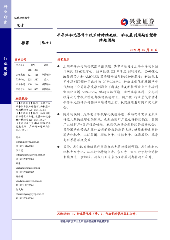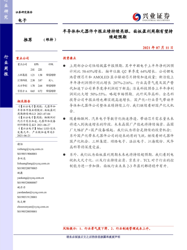 【兴业证券】【20210711】电子行业周报:半导体和元器件中报业绩持续亮眼,面板盈利周期有望持续超预期-8页
