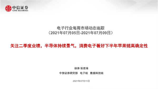 【中信证券】【20210711】电子行业每周市场动态追踪:关注二季度业绩,半导体持续景气,消费电子看好下半年苹果链高确定性-22页
