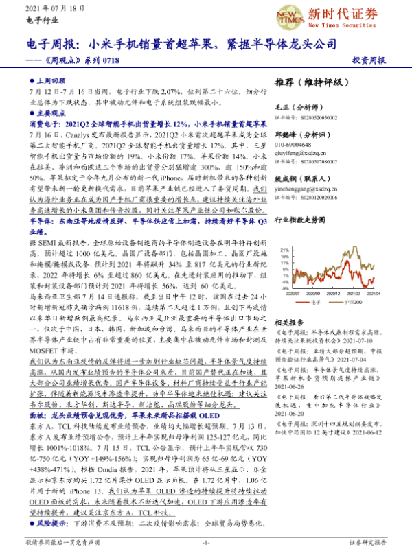 【新时代证券】【20210718】电子周报:小米手机销量首超苹果,紧握半导体龙头公司-19页