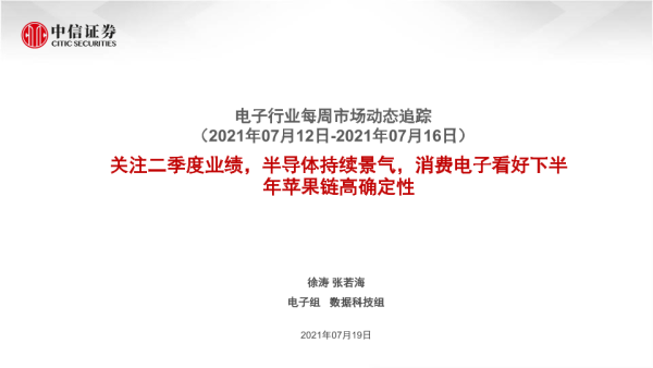 【中信证券】【20210719】电子行业每周市场动态追踪:关注二季度业绩,半导体持续景气,消费电子看好下半年苹果链高确定性-21页