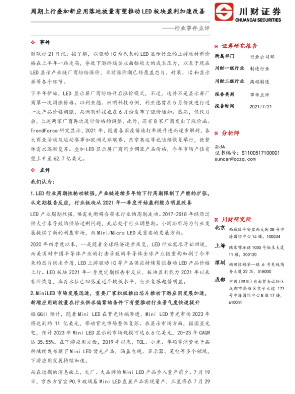 【川财证券】【20210721】制造行业事件点评:周期上行叠加新应用落地放量有望推动LED板块盈利加速改善-3页