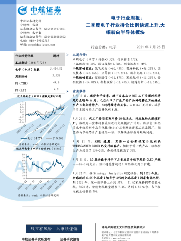 【中航证券】【20210725】20210725-中航证券-电子行业周报:二季度电子行业持仓比例快速上升,大幅转向半导体板块-13页