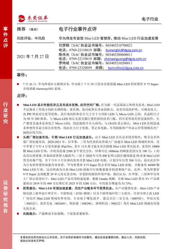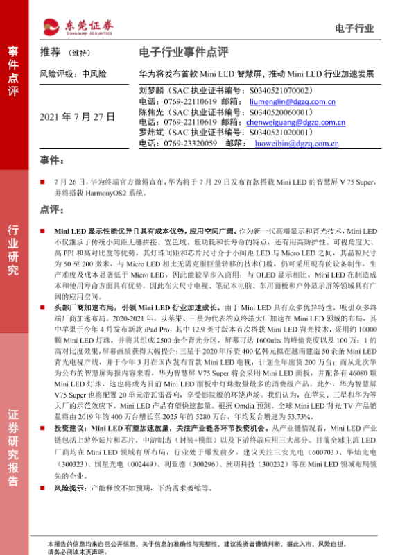 【东莞证券】【20210727】电子行业事件点评:华为将发布首款Mini LED智慧屏,推动Mini LED行业加速发展-2页