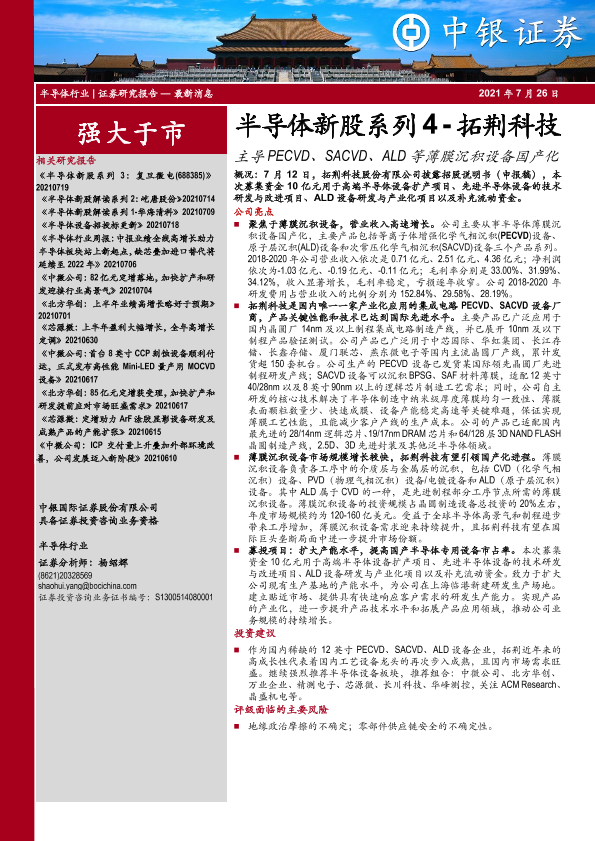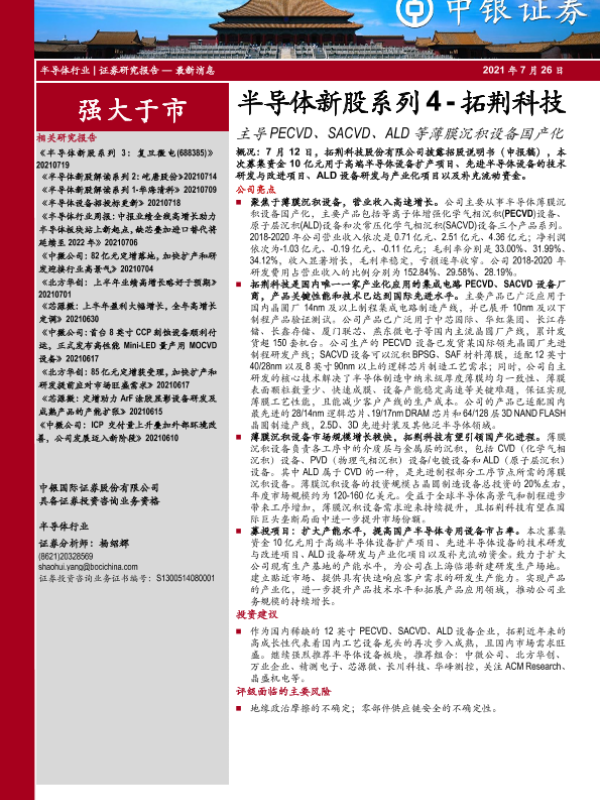 【中银证券】【20210726】半导体新股系列4-拓荆科技:主导PECVD、SACVD、ALD等薄膜沉积设备国产化-19页