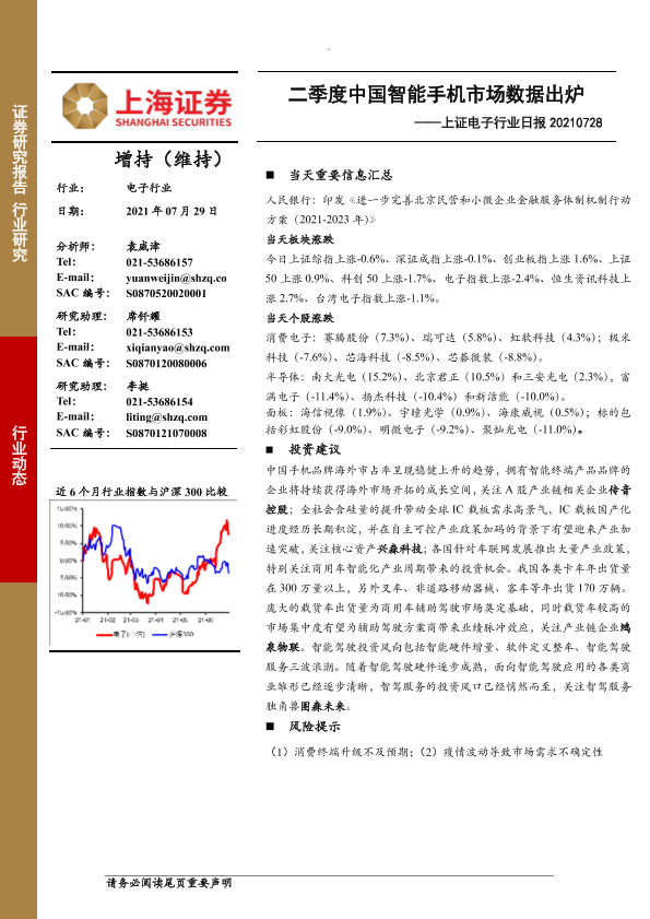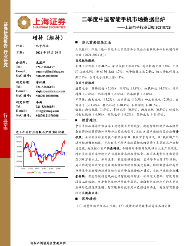 【上海证券】【20210729】上证电子行业日报:二季度中国智能手机市场数据出炉-6页