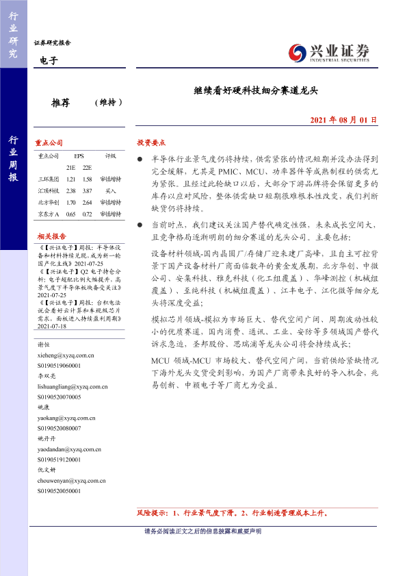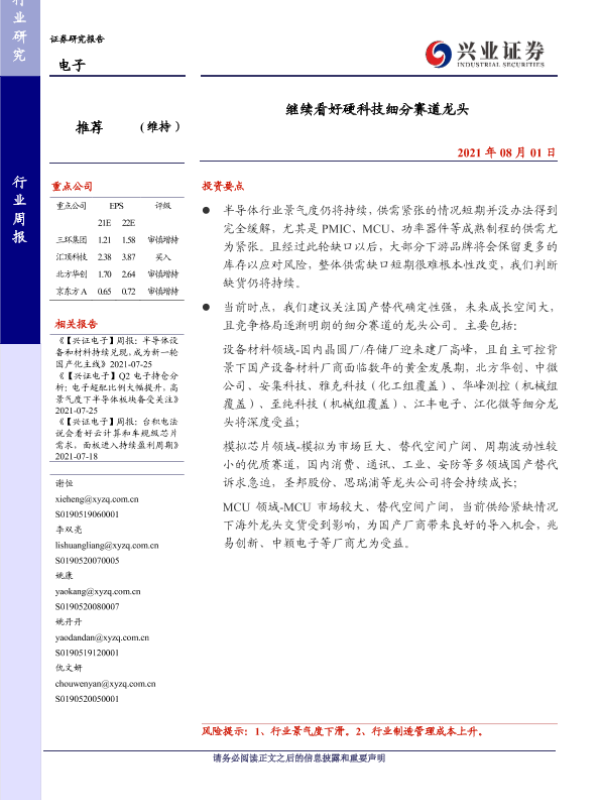 【兴业证券】【20210801】20210801-兴业证券-电子行业周报:继续看好硬科技细分赛道龙头-9页