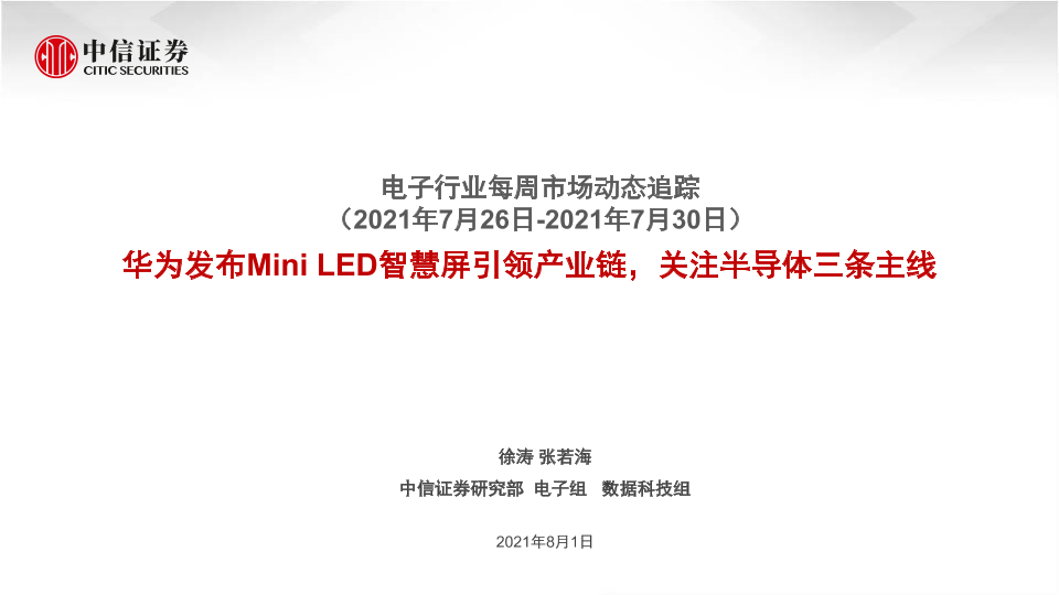 【中信证券】【20210801】电子行业每周市场动态追踪:华为发布Mini LED智慧屏引领产业链,关注半导体三条主线-21页