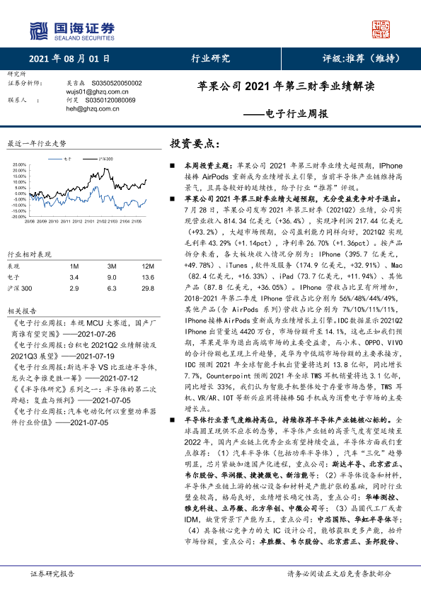 【国海证券】【20210801】20210801-国海证券-电子行业周报:苹果公司2021年第三财季业绩解读-22页