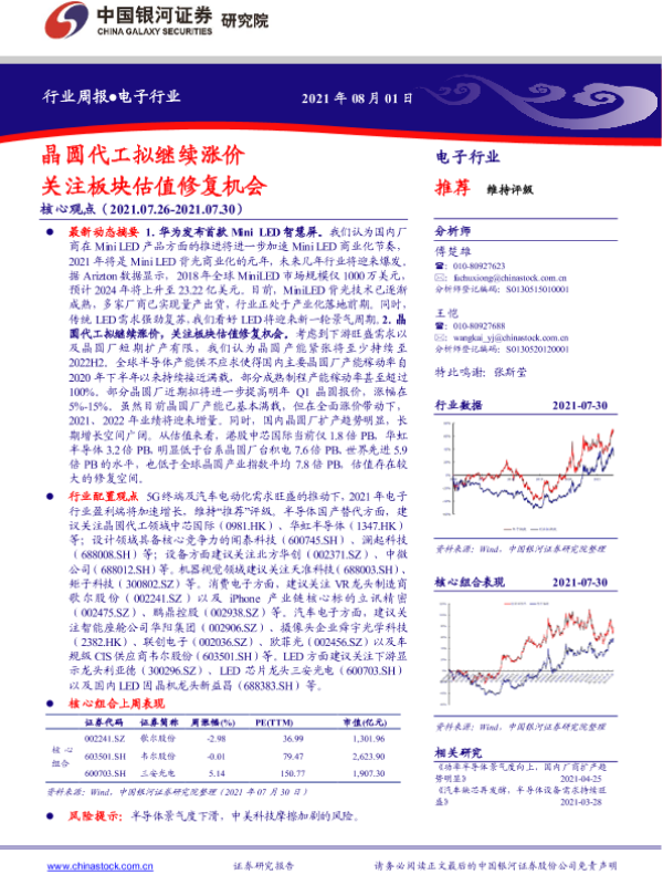 【银河证券】【20210801】电子行业周报:晶圆代工拟继续涨价关注板块估值修复机会-26页