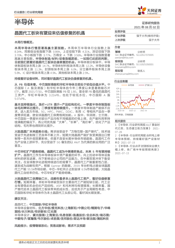 【天风证券】【20210802】20210802-天风证券-半导体行业研究周报:晶圆代工板块有望迎来估值修复的机遇-13页
