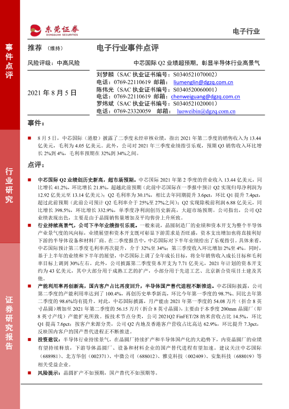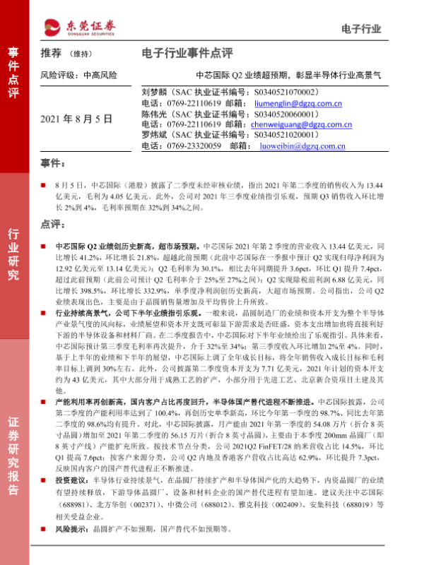 【东莞证券】【20210805】20210805-东莞证券-电子行业事件点评:中芯国际Q2业绩超预期,彰显行业高景气-2页