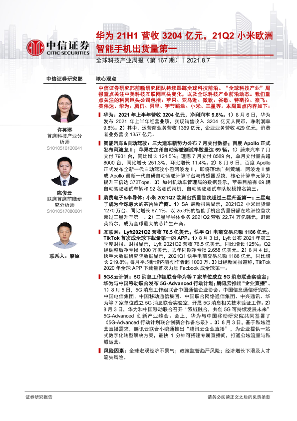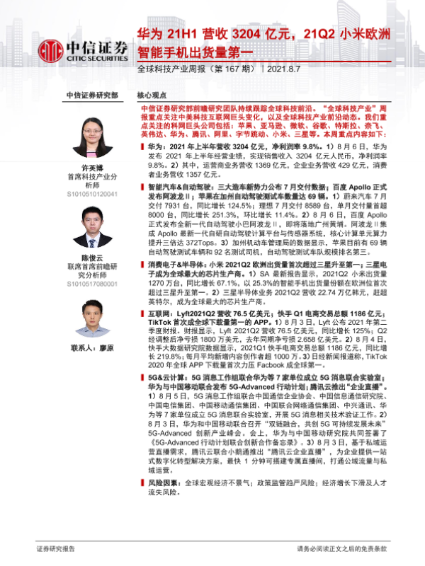 【中信证券】【20210807】全球科技产业周报(第167期):华为21H1营收3204亿元,21Q2小米欧洲智能手机出货量第一-15页