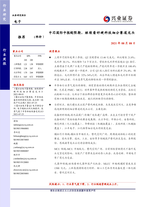 【兴业证券】【20210808】20210808-兴业证券-电子行业周报:中芯国际中报超预期,继续看好硬科技细分赛道龙头-9页