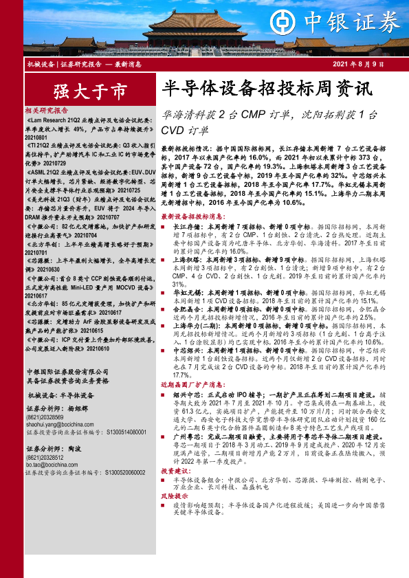 【中银证券】【20210809】20210809-中银证券-半导体设备招投标周资讯:华海清科获2台CMP订单,沈阳拓荆获1台CVD订单-3页