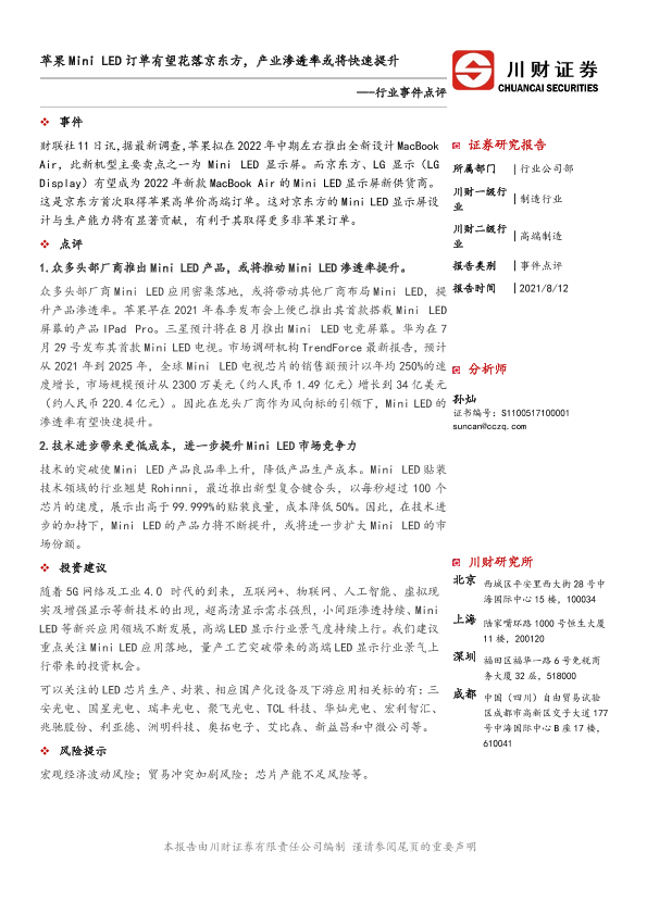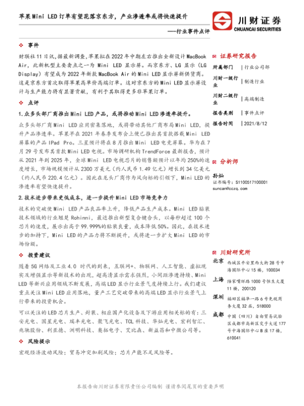 【川财证券】【20210812】苹果MiniLED订单有望花落京东方,产业渗透率或将快速提升-2页