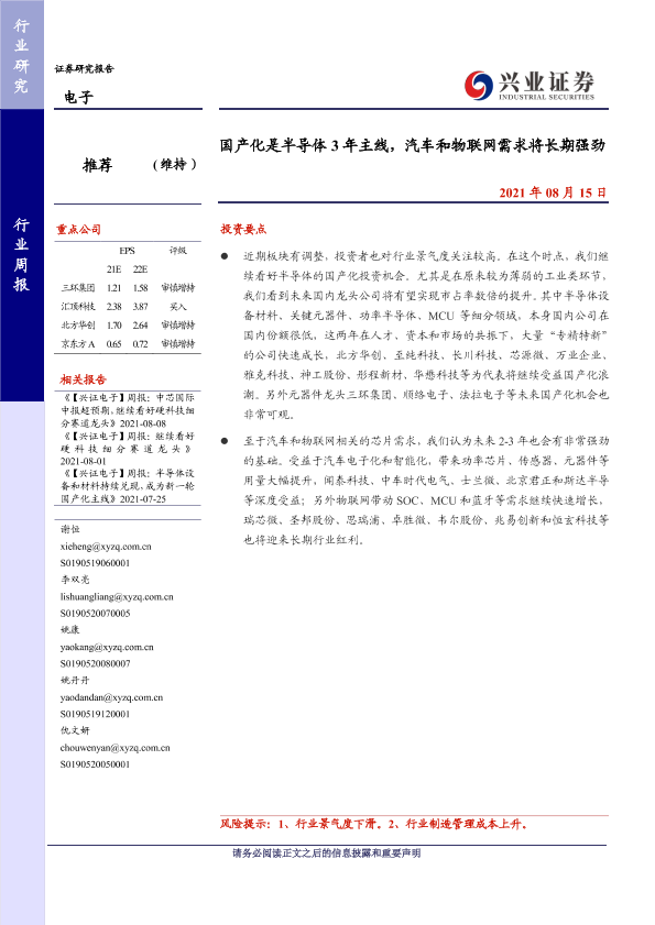 【兴业证券】【20210815】国产化是半导体3年主线,汽车和物联网需求将长期强劲-9页