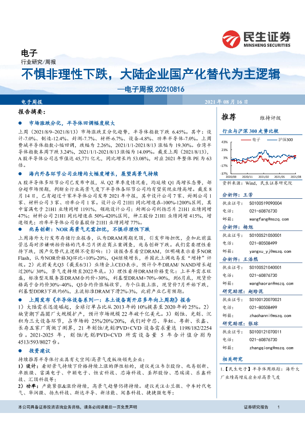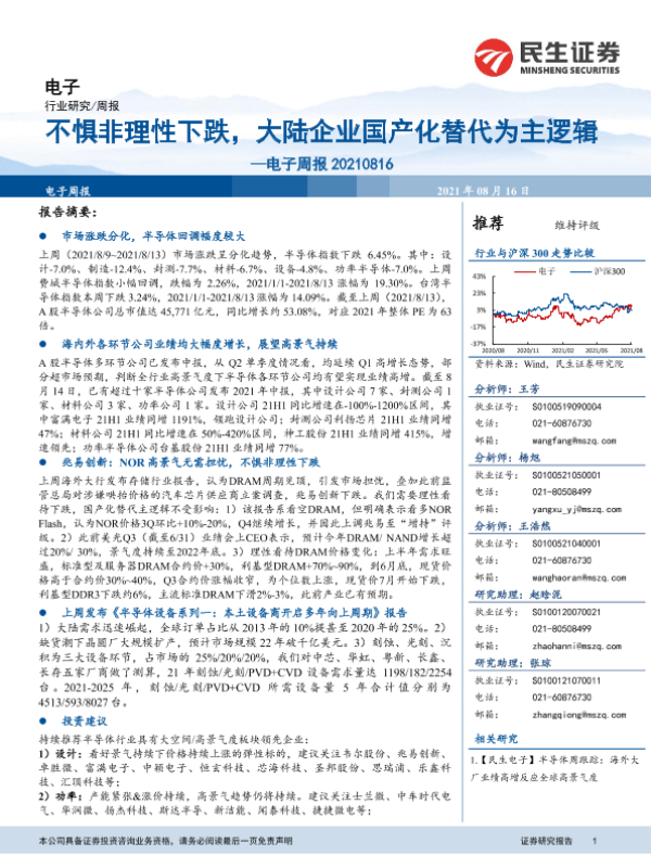 【民生证券】【20210816】电子周报:不惧非理性下跌,大陆企业国产化替代为主逻辑-16页