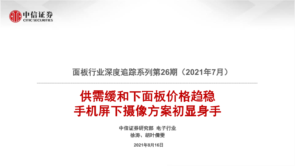 【中信证券】【20210816】面板行业深度追踪系列第26期(2021年7月):供需缓和下面板价格趋稳,手机屏下摄像方案初显身手-21页