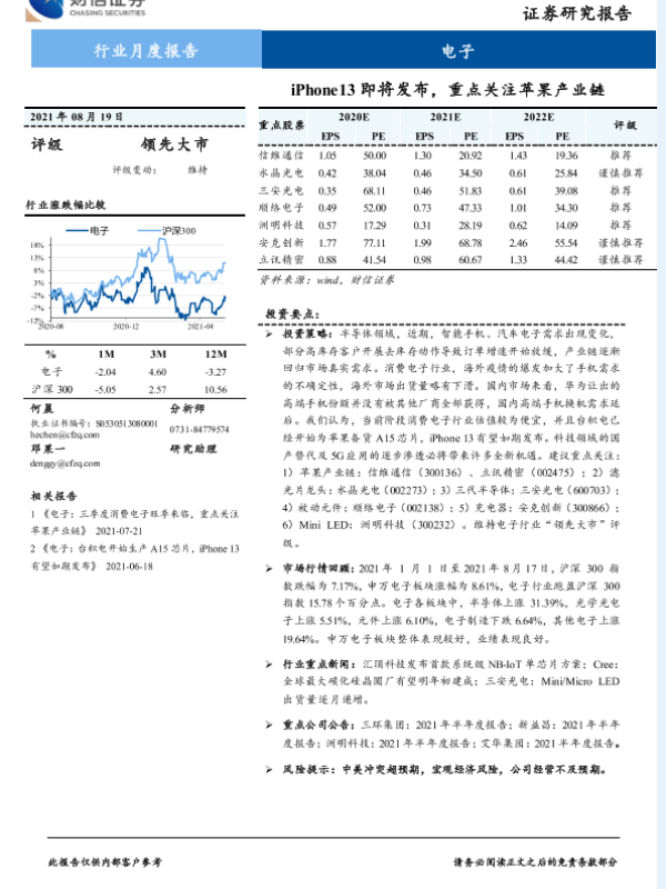 【财信证券】【20210819】电子行业月度报告:iPhone13即将发布,重点关注苹果产业链-10页
