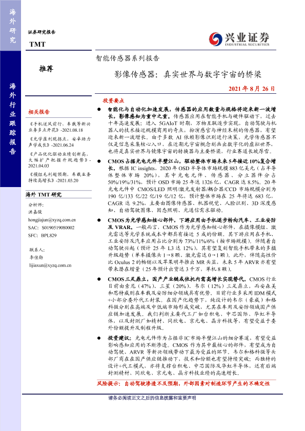 【兴业证券】【20210826】智能传感器系列报告:影像传感器:真实世界与数字宇宙的桥梁-12页
