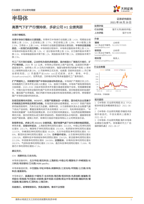 【天风证券】【20210829】半导体行业研究周报:高景气下扩产行情持续,多家公司H1业绩亮眼-24页