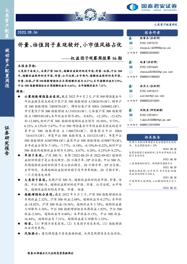 【国泰君安证券】【20220904】权益因子观察周报第16期:价量、估值因子表现较好,小市值风格占优-16页
