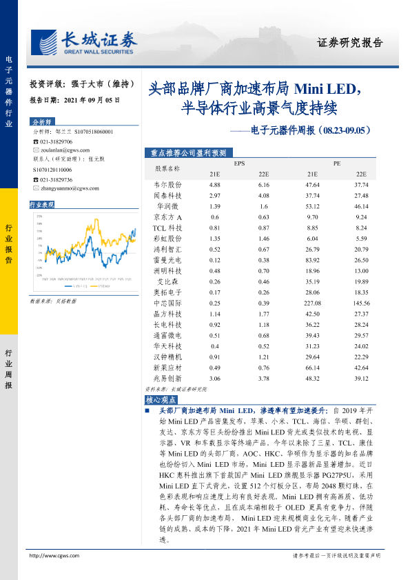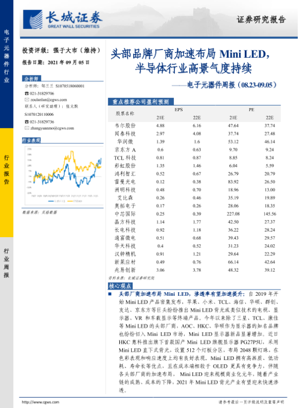【长城证券】【20210905】电子元器件周报:头部品牌厂商加速布局Mini LED,半导体行业高景气度持续-18页