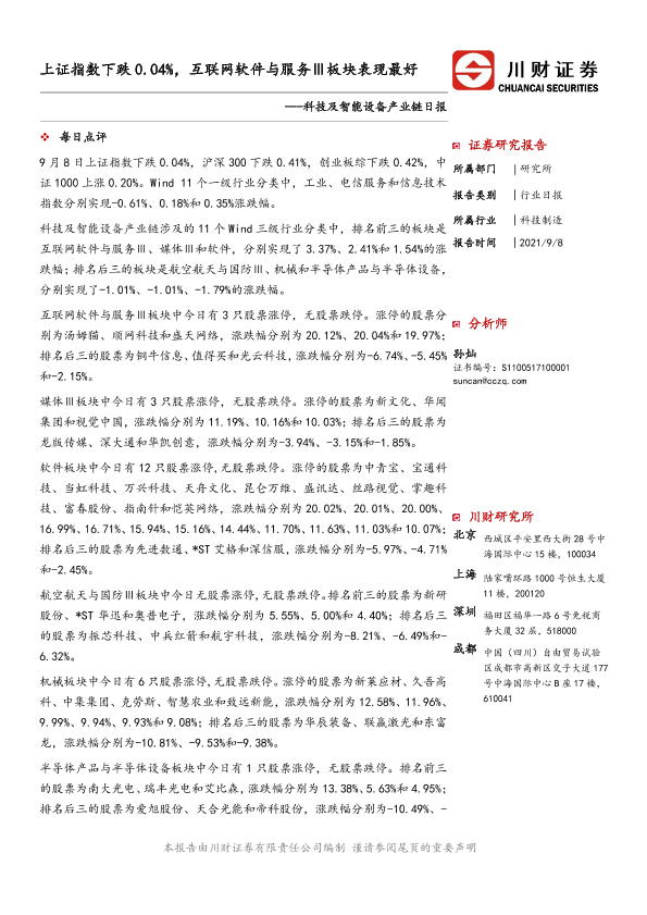 【川财证券】【20210908】科技及智能设备产业链日报:上证指数下跌0.04%,互联网软件与服务Ⅲ板块表现最好-4页