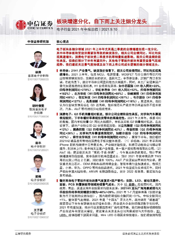 【中信证券】【20210910】电子行业2021年中报总结:板块增速分化,自上而下关注细分龙头-12页