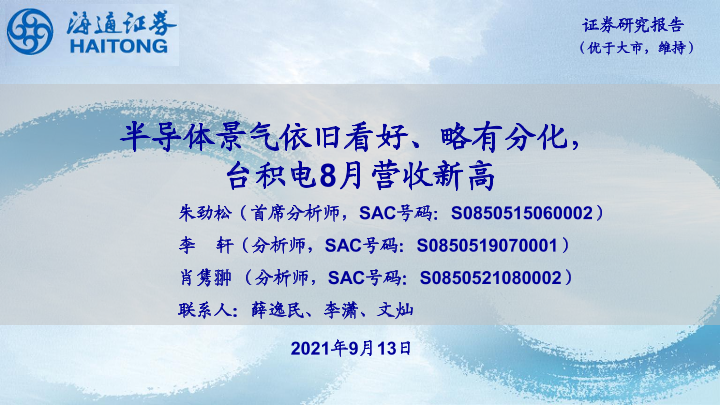 【海通证券】【20210913】电子:半导体景气依旧看好、略有分化,台积电8月营收新高-10页