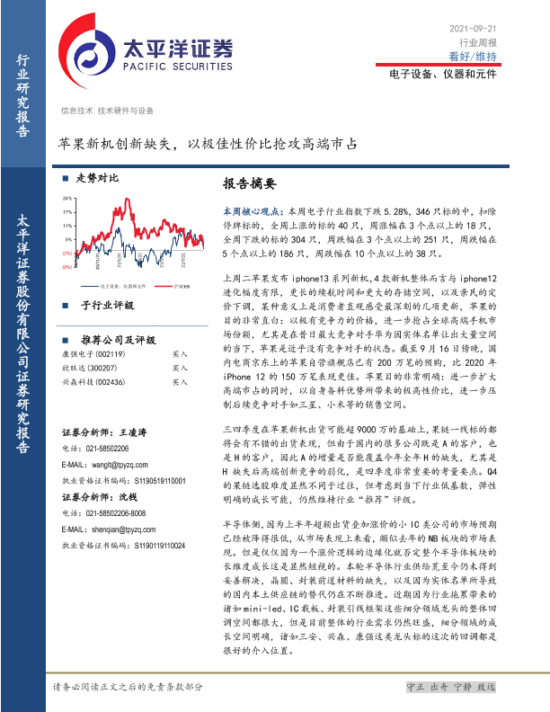 【太平洋证券】【20210921】20210921-太平洋-电子设备、仪器和元件行业周报:苹果新机创新缺失,以极佳性价比抢攻高端市占-14页
