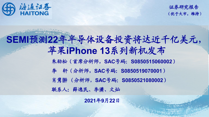 【海通证券】【20210922】SEMI预测22年半导体设备投资将达近千亿美元,苹果iPhone13系列新机发布-10页