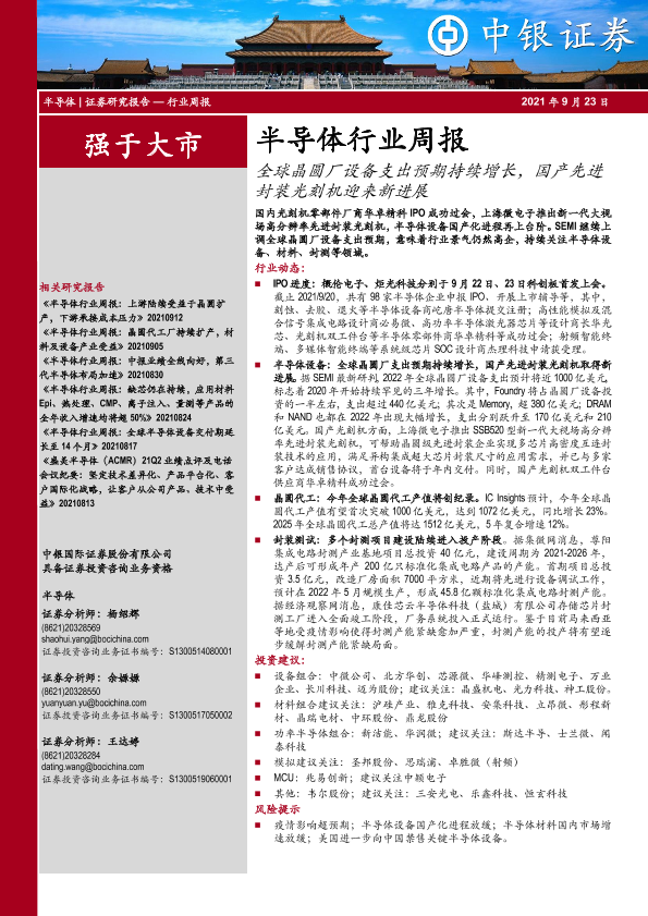 【中银证券】【20210923】20210923-中银证券-半导体行业周报:全球晶圆厂设备支出预期持续增长,国产先进封装光刻机迎来新进展-16页