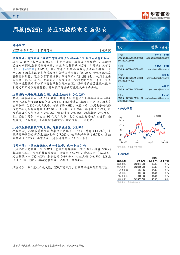 【华泰证券】【20210926】电子周报(9 25):关注双控限电负面影响-16页