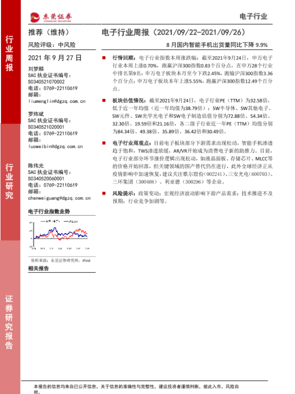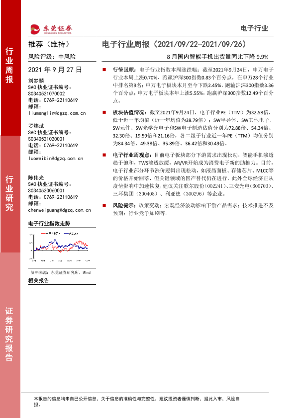 【东莞证券】【20210927】电子行业周报:8月国内智能手机出货量同比下降9.9%-14页