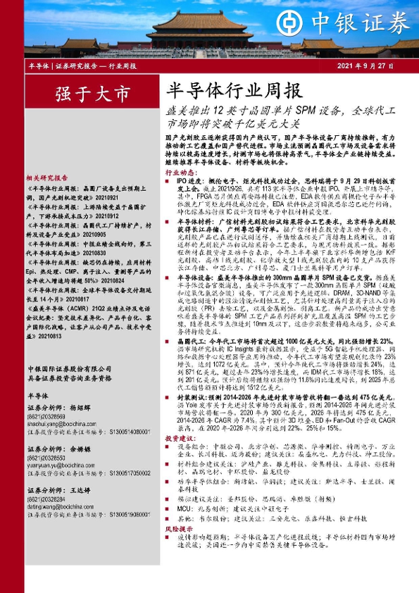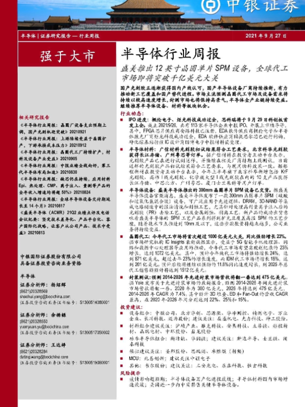 【中银证券】【20210927】半导体行业周报:盛美推出12英寸晶圆单片SPM设备,全球代工市场即将突破千亿美元大关-16页