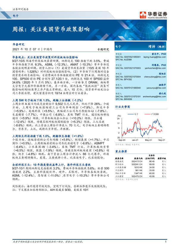 【华泰证券】【20211007】电子周报:关注美国货币政策影响-15页