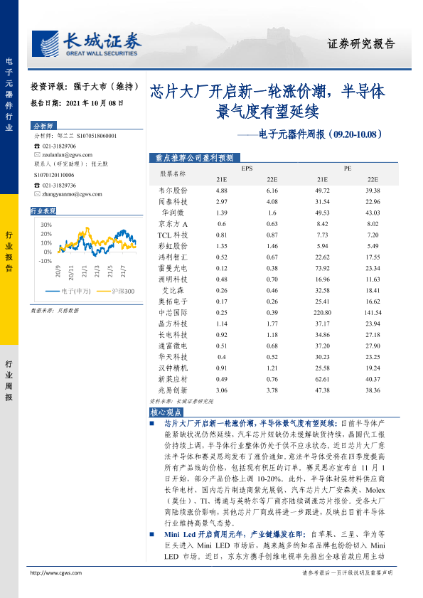 【长城证券】【20211008】电子元器件周报:芯片大厂开启新一轮涨价潮,半导体景气度有望延续-16页