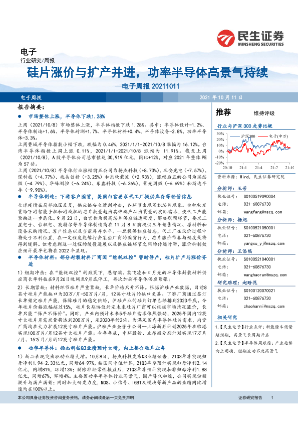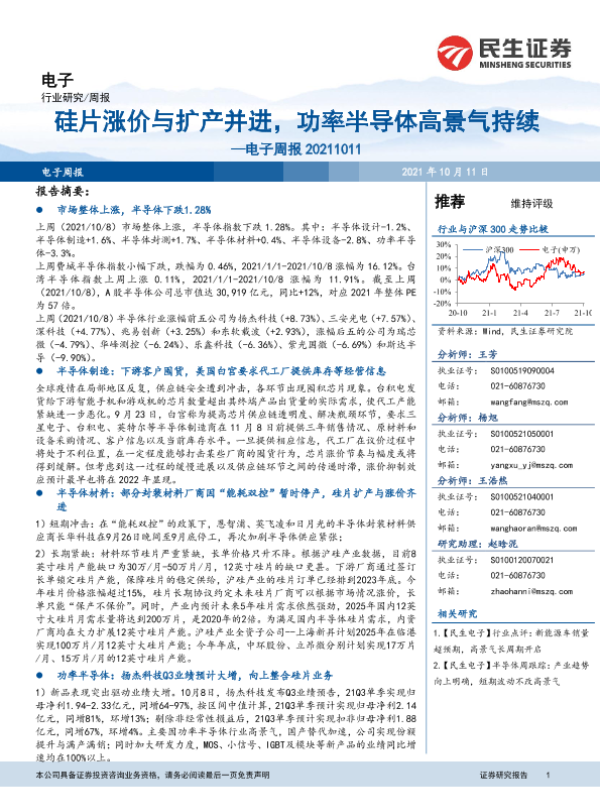【民生证券】【20211011】电子周报:硅片涨价与扩产并进,功率半导体高景气持续-15页