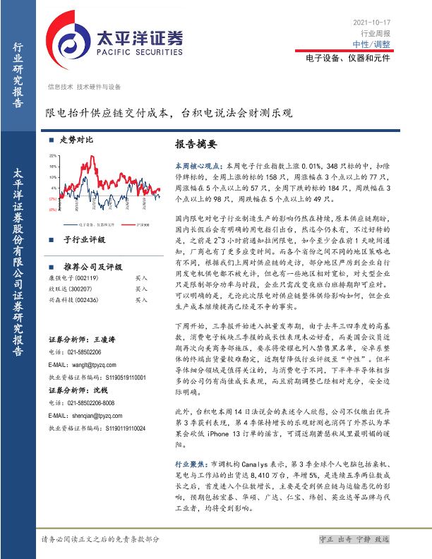 【太平洋证券】【20211017】20211017-太平洋-电子设备、仪器和元件行业周报:限电抬升供应链交付成本,台积电说法会财测乐观-14页