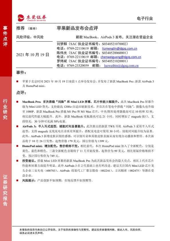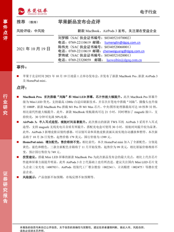 【东莞证券】【20211019】电子:苹果新品发布会点评:新款MacBook、AirPods 3发布,关注潜在受益企业-2页