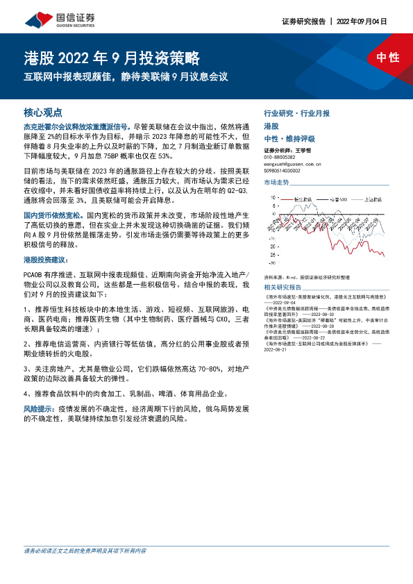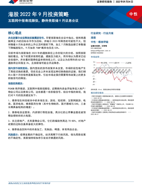 【国信证券】【20220904】港股2022年9月投资策略:互联网中报表现颇佳,静待美联储9月议息会议-22页