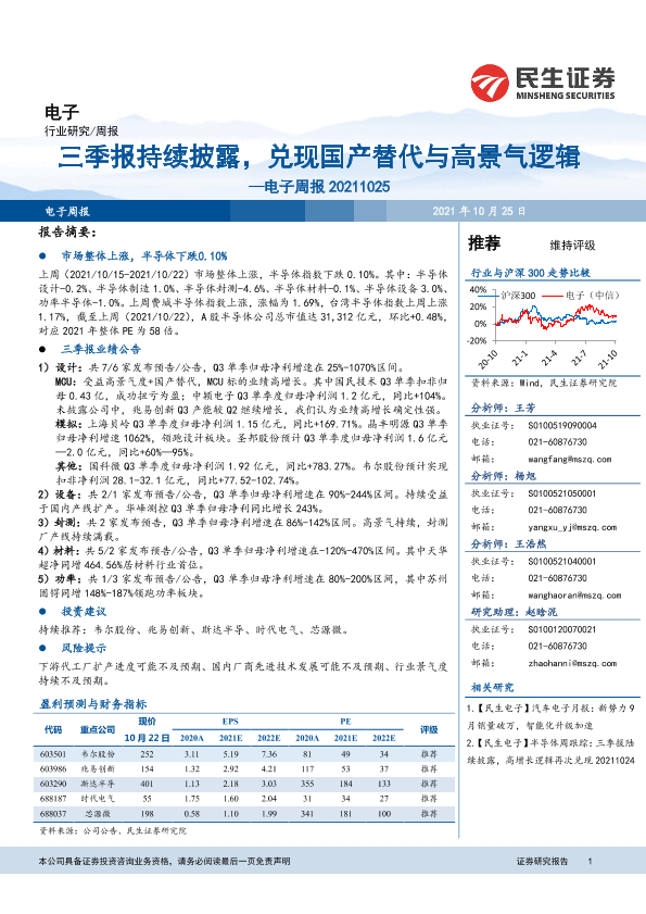 【民生证券】【20211025】20211025-民生证券-电子周报:三季报持续披露,兑现国产替代与高景气逻辑-15页