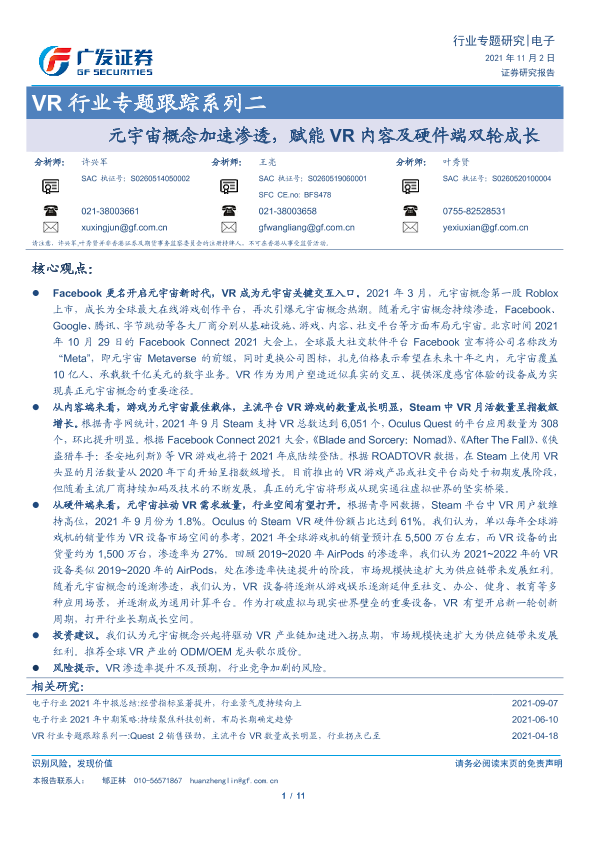 【广发证券】【20211102】VR行业专题跟踪系列二:元宇宙概念加速渗透,赋能VR内容及硬件端双轮成长-11页