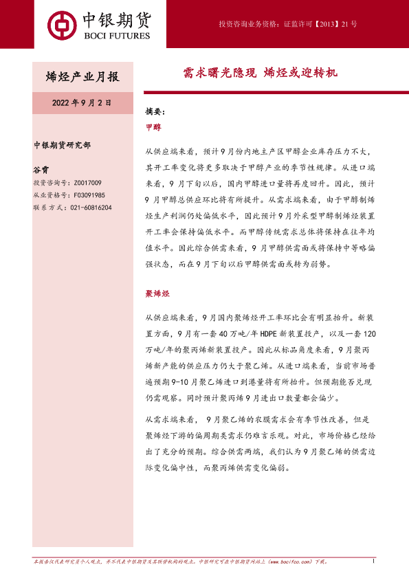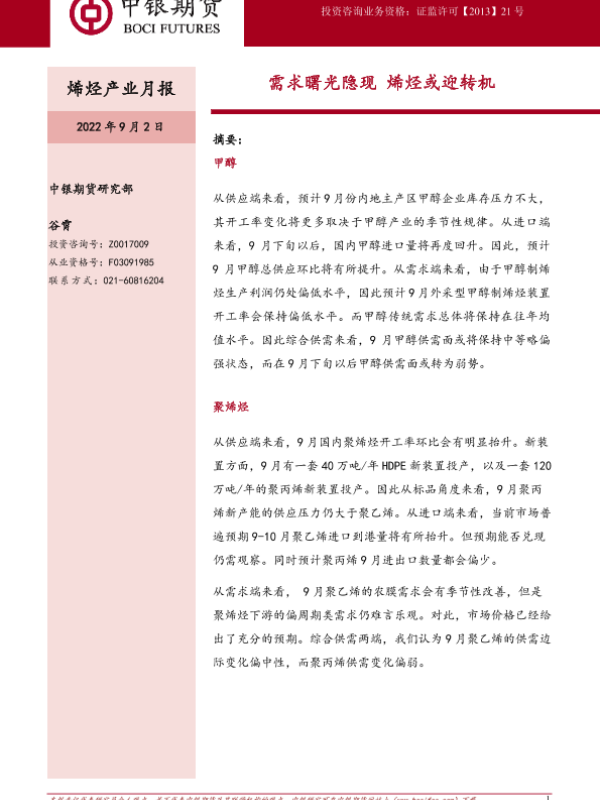 【中银期货】【20220902】烯烃产业月报:需求曙光隐现,烯烃或迎转机-22页