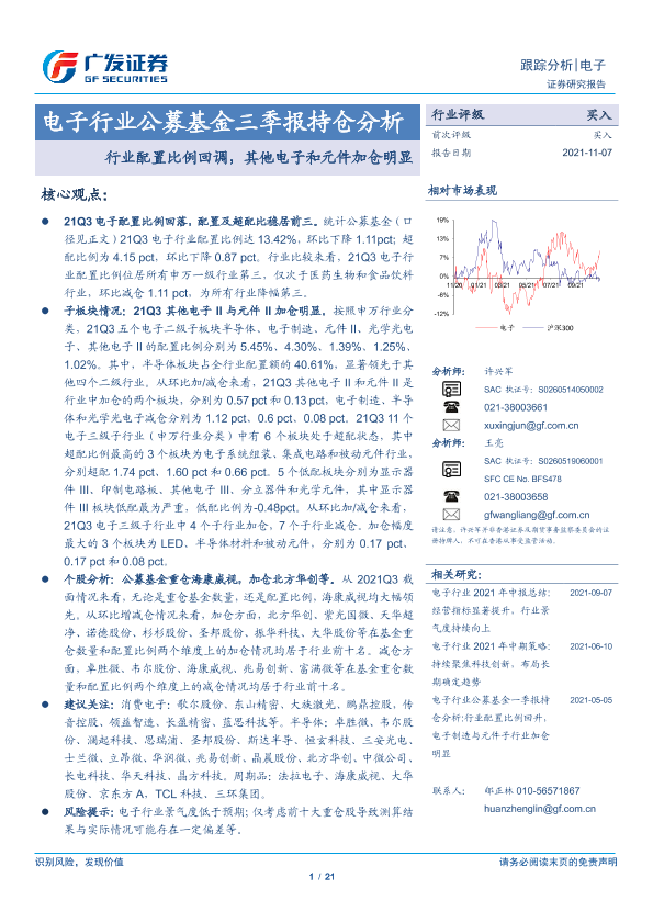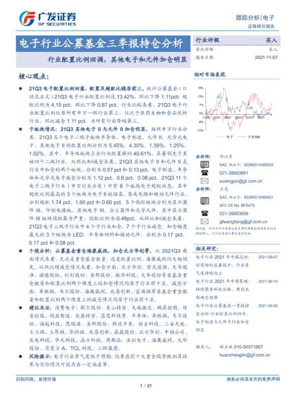 【广发证券】【20211107】电子行业公募基金三季报持仓分析:行业配置比例回调,其他电子和元件加仓明显-21页