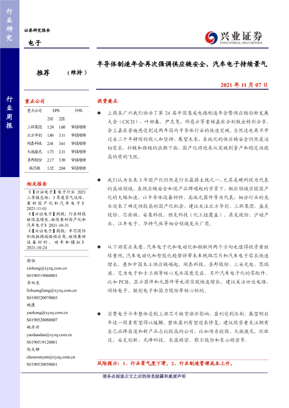 【兴业证券】【20211107】20211107-兴业证券-电子行业周报:半导体制造年会再次强调供应链安全,汽车电子持续景气-9页