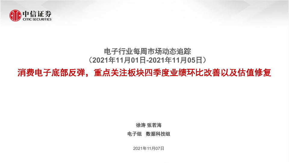 【中信证券】【20211107】电子行业每周市场动态追踪:消费电子底部反弹,重点关注板块四季度业绩环比改善以及估值修复-21页