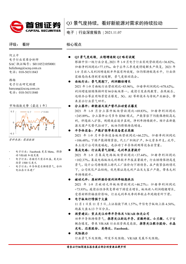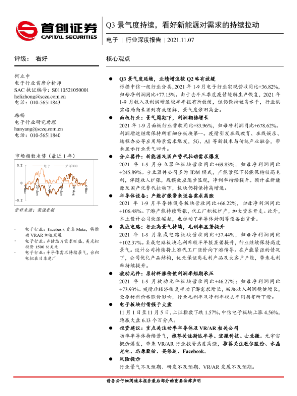 【首创证券】【20211107】20211107-首创证券-电子行业深度报告:Q3景气度持续,看好新能源对需求的持续拉动-20页