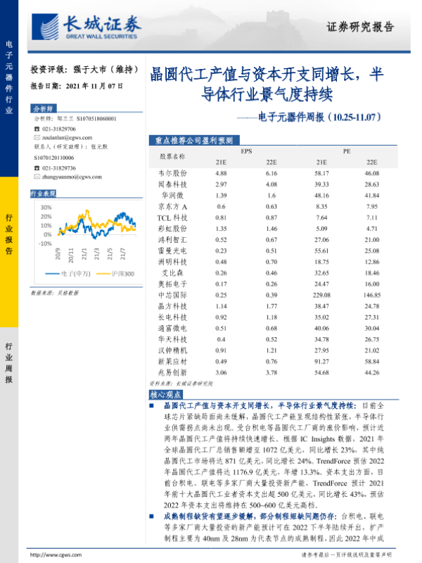 【长城证券】【20211107】电子元器件周报:晶圆代工产值与资本开支同增长,半导体行业景气度持续-13页